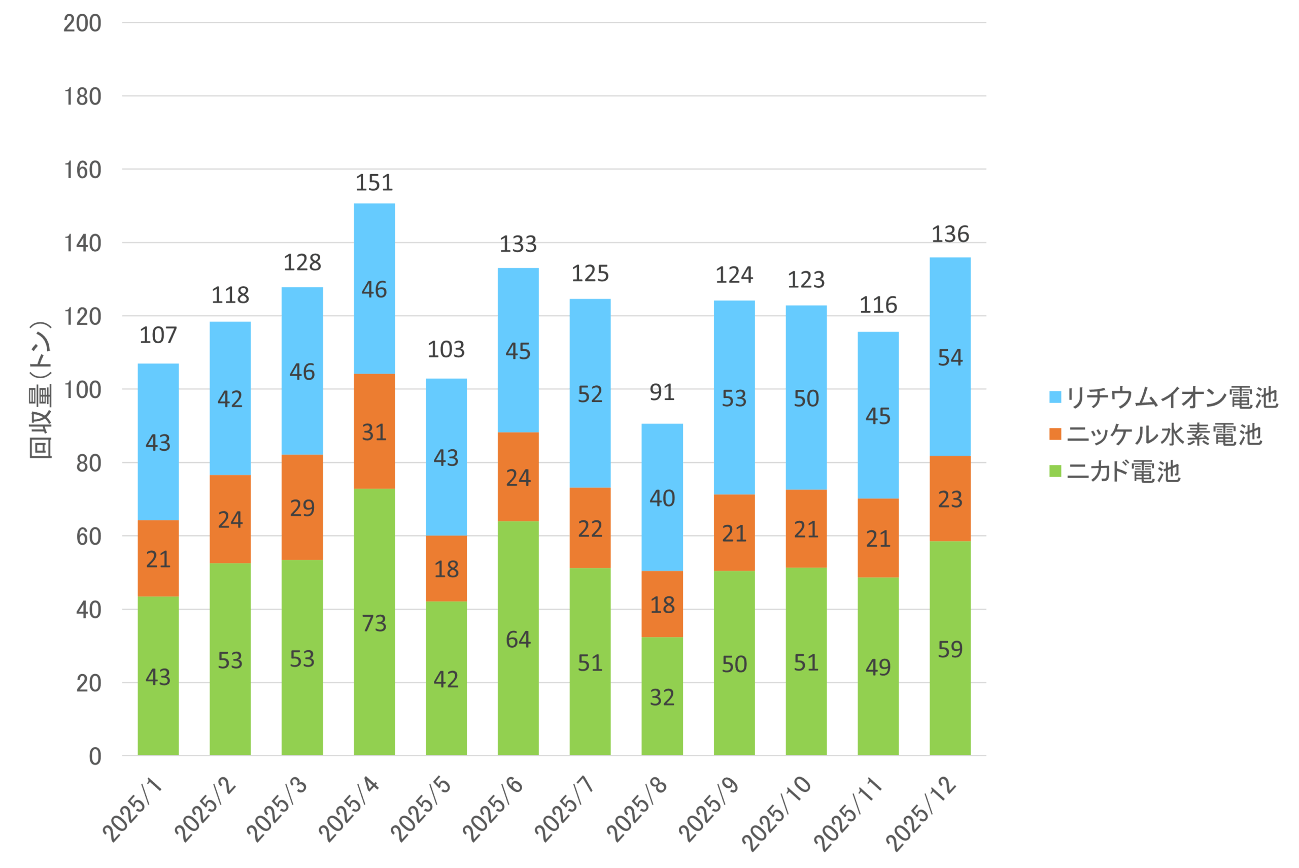 リサイクル実績はJBRCの小型充電式電池回収実績(月次推移、年次推移)と再資源化実績を集計したものです。